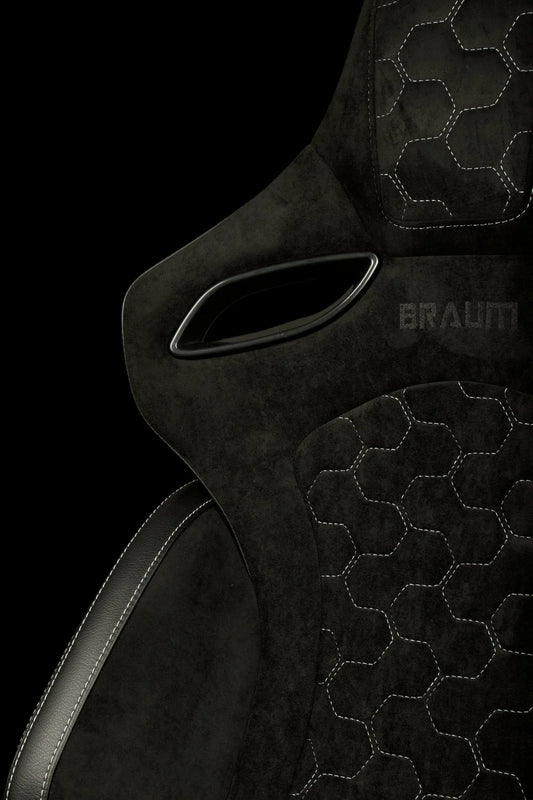 BRAUM ORUE-S Series Sport Reclinable Seats (Black Leatherette | Honeycomb Alcantara | White Stitching) – Priced Per Pair